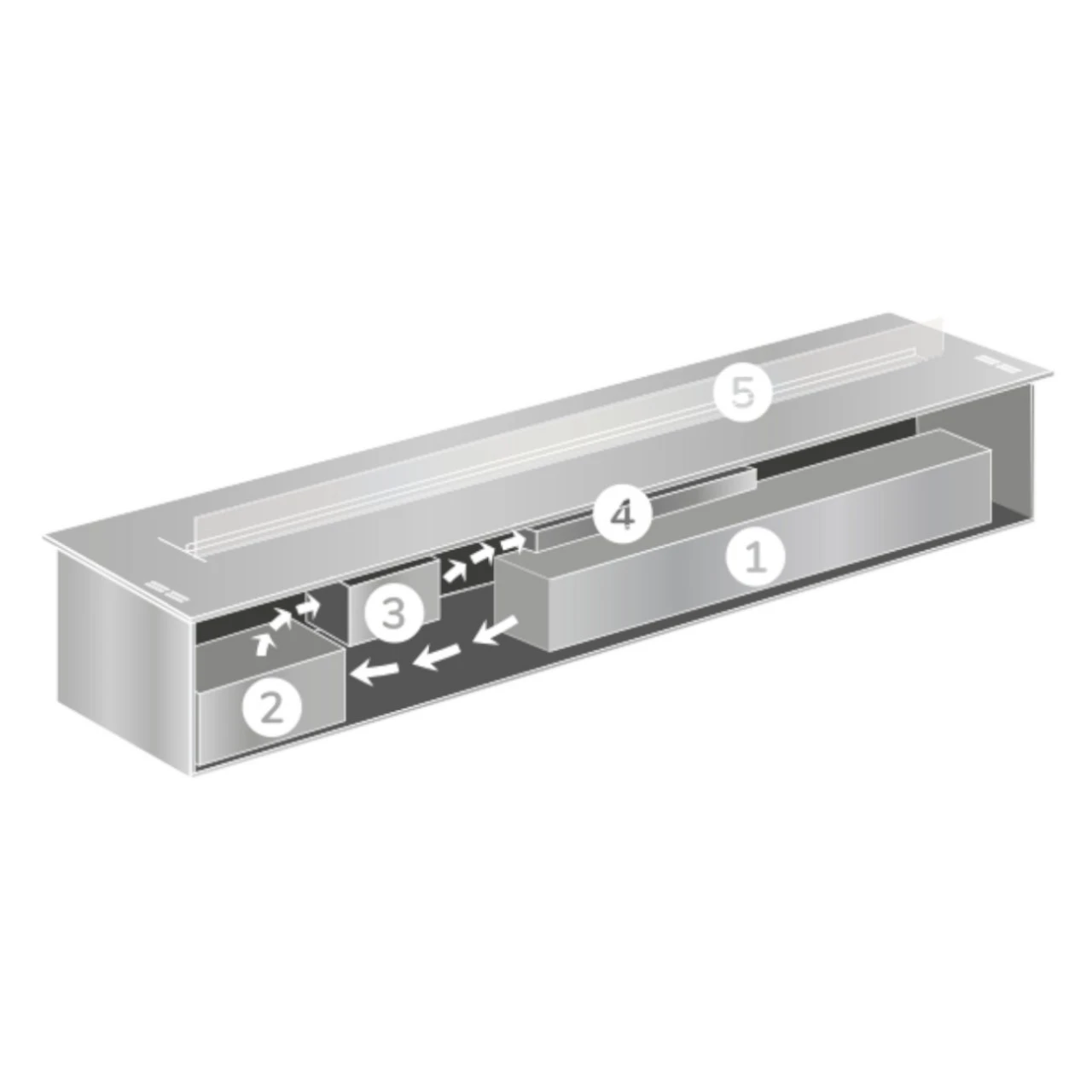 • Verbrennung mit BEV-Technologie (Burning Ethanol Vapours). Das bedeutet, dass das Bioethanol vorgewärmt wird, bevor es das Verbrennungsrohr erreicht, so dass die Mischung zwischen dem Feuer und dem Bioethanol optimal wird. Dies führt zu einer besseren Ausnutzung des Bioethanols und zu einer saubereren Verbrennung.