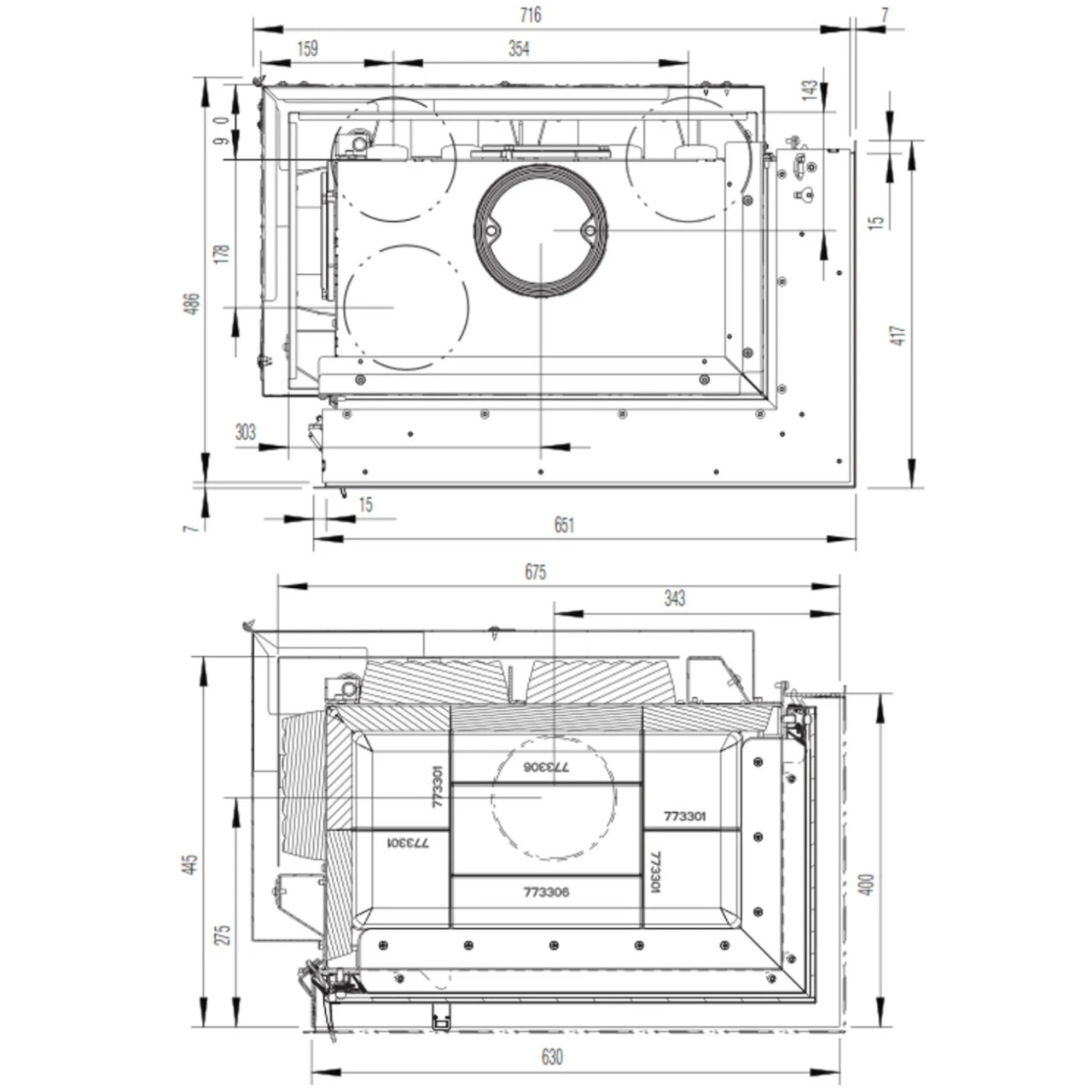 Brandsicherheit: Dämmdicke hinten 120 mm, Dämmdicke Seite 100 mm, Dämmdicke Boden 0