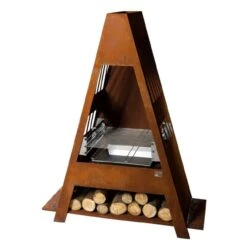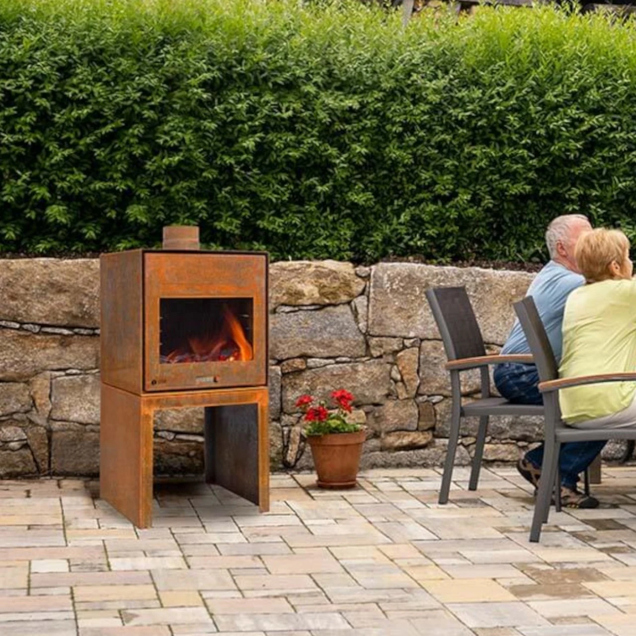 Der Gartenkamin Runa ist aus starkem Cortenstahl gebaut und damit absolut wetterfest. Der Cortenstahl bildet innerhalb weniger Wochen eine wunderschöne Edelrost-Patina aus, die das Metall schützt und wundervoll mit den warmen Farben des Feuers harmoniert. Praktisch: Auf drei Ebenen kannst du den separat erhältlichen Grillrost einschieben und so direkt im Kamin grillen. Außerdem ist er mit einem Ofenrohr sowie einer Ofenrohrabdeckung erweiterbar.