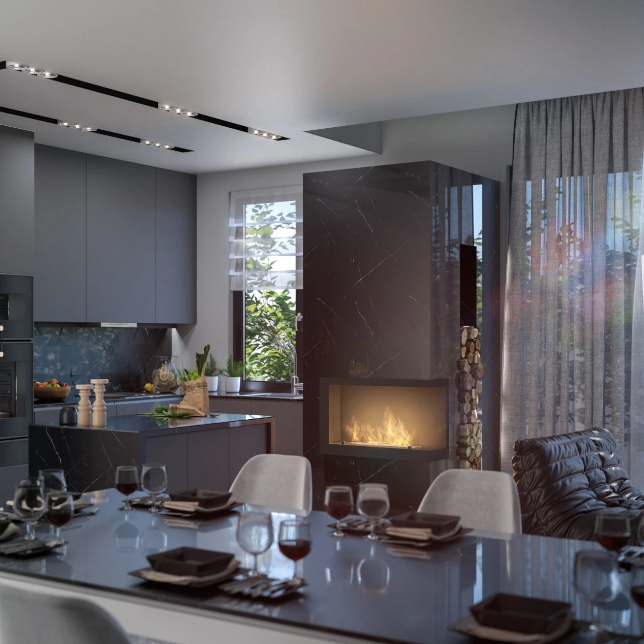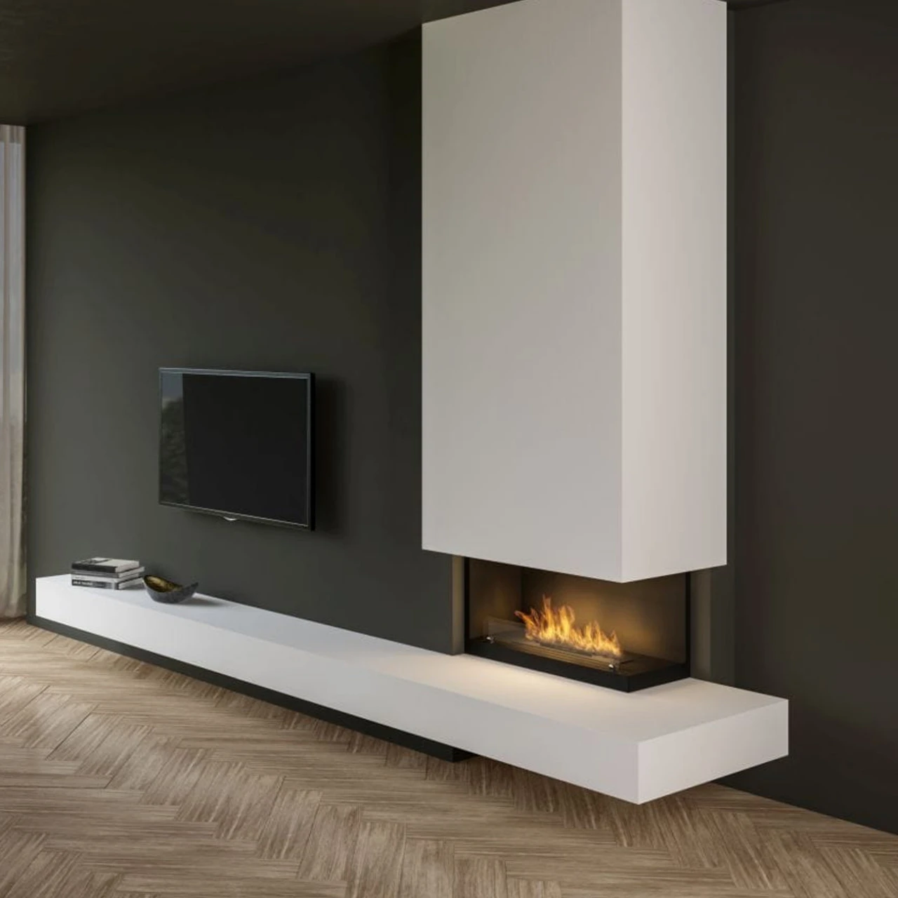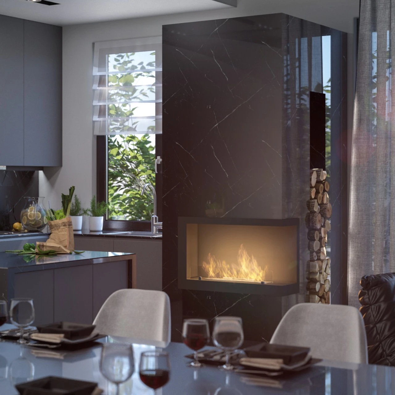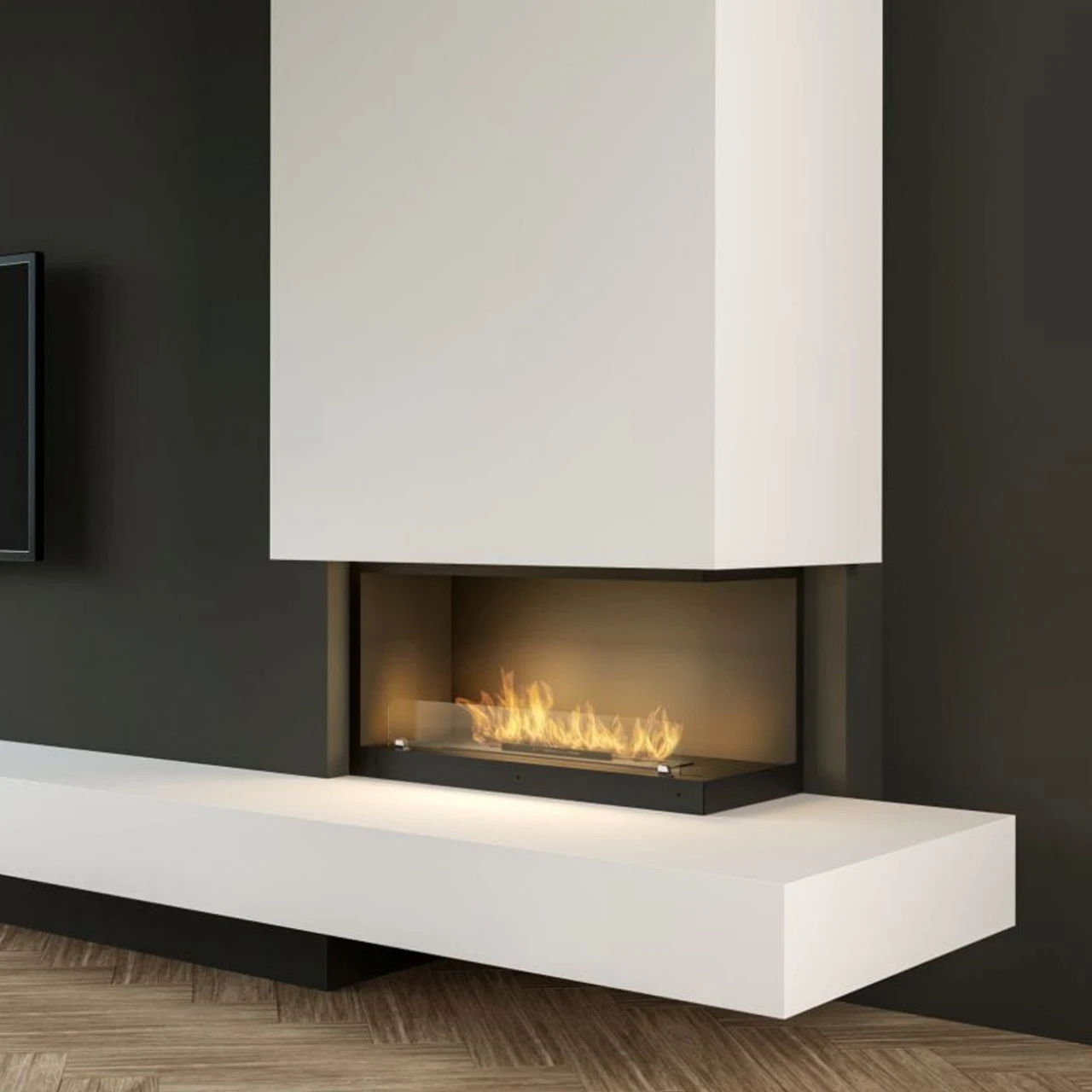 Das Eckmodell P800, mit offener rechter Seite, ist bestens zum Einbau in einer Nische geeignet. Die Konstruktion des Ethanolkamins gewährleistet eine einfache Montage und eine effektive Ausarbeitung, ohne dass der Rand der Aussparung in der Wand ideal bearbeitet werden muss. Der Ethanolkamin ist mit einem Rahmen erhältich, der über die Umrisse des Kamins hinausragt und die Wand überlappt (je nach Variante). Die leicht getönte Scheibe stabilisiert das Feuer und verleiht ein einzigartiges Aussehen.