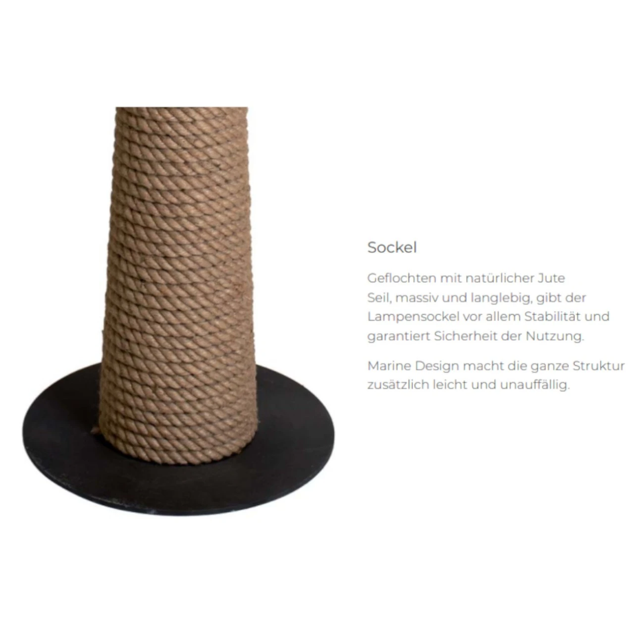 Geflochten mit natürlicher Jute Seil, massiv und langlebig, gibt der Lampensockel vor allem Stabilität und garantiert Sicherheit der Nutzung. Marine Design macht die ganze Struktur zusätzlich leicht und unauffällig.