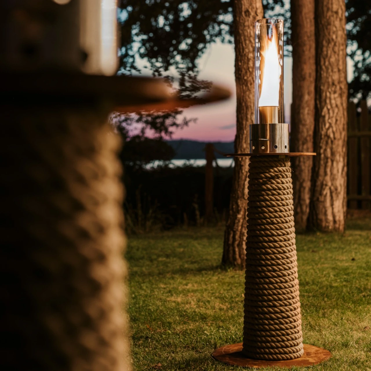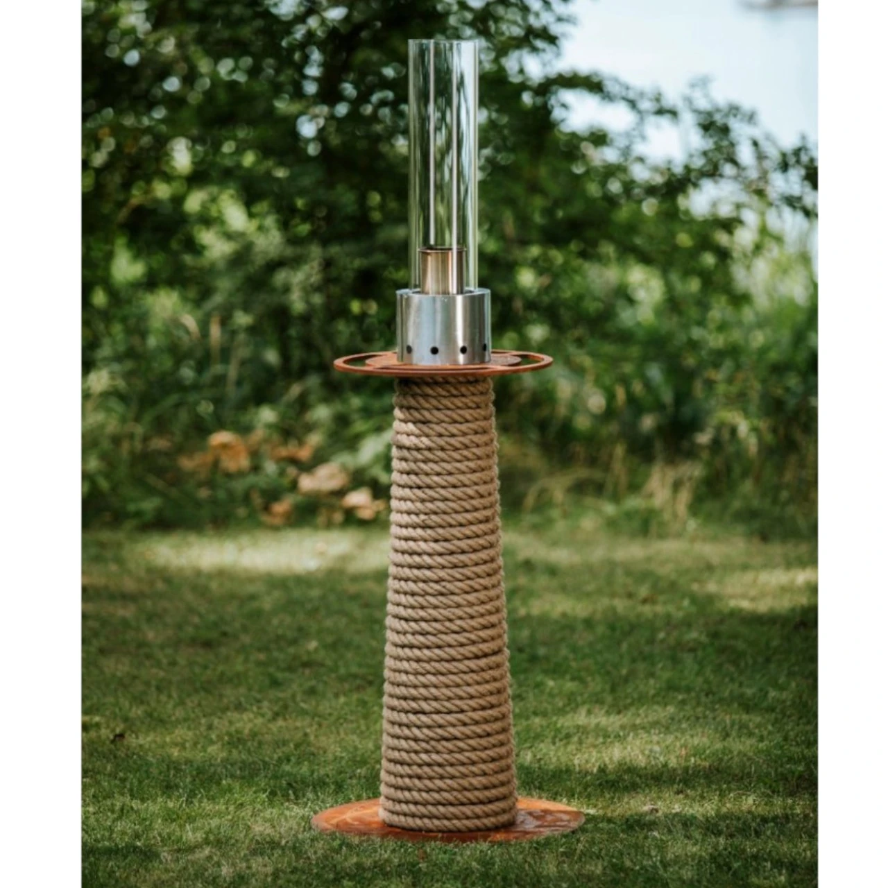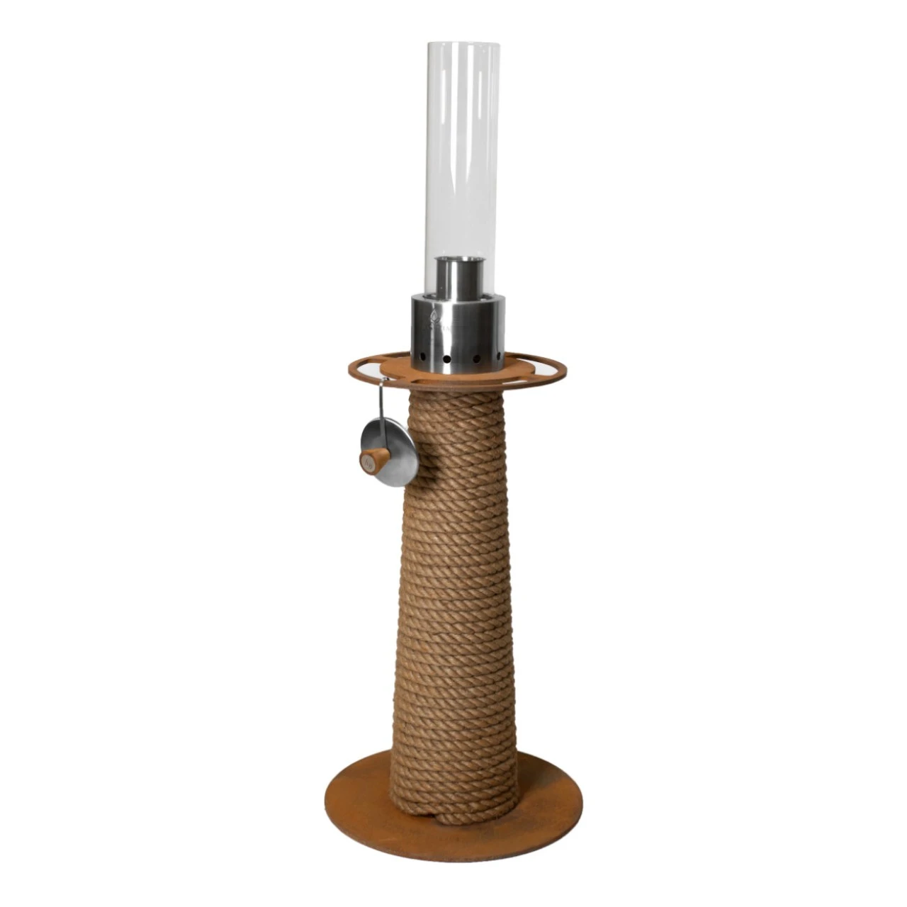 Material: Cortenstahl, Edelstahl, Hitzbeständiges Glas, Jute-Seil Beige