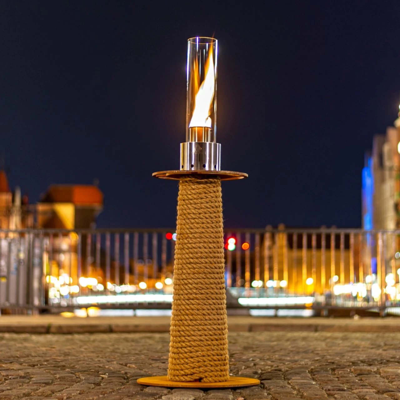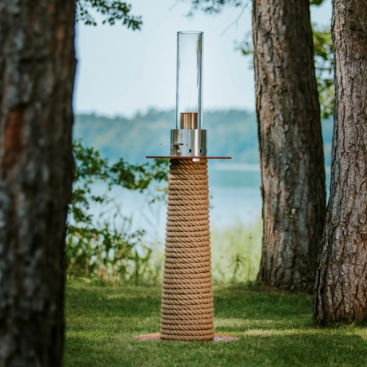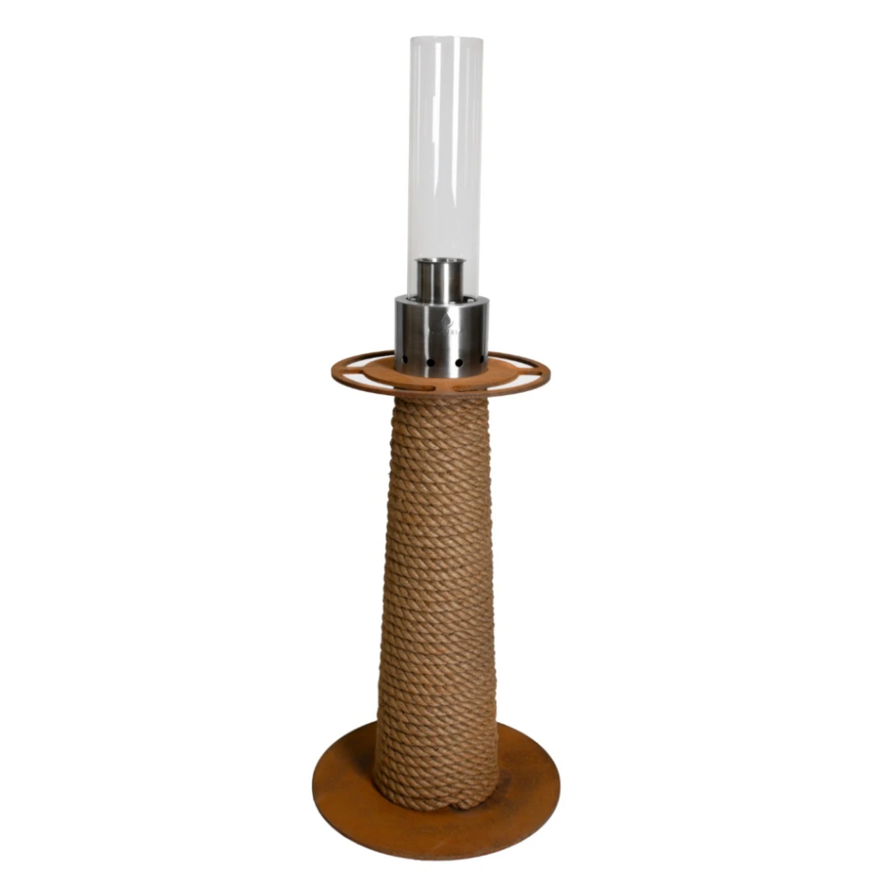 Material: Cortenstahl, Edelstahl, Hitzbeständiges Glas, Jute-Seil Beige