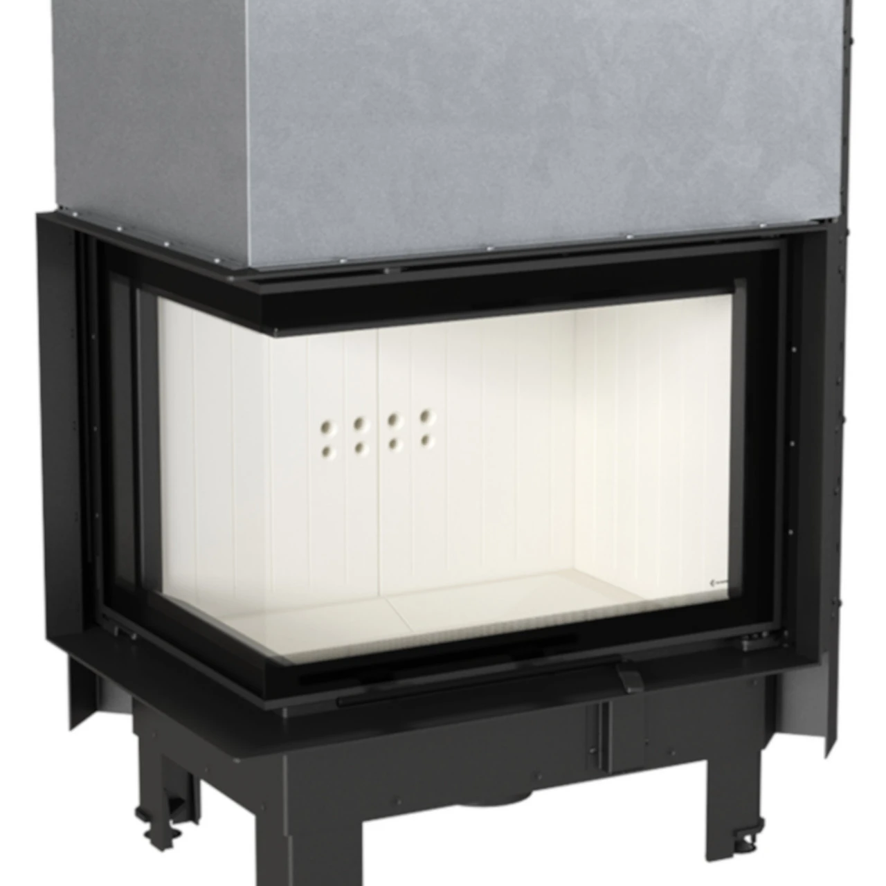 Modell: Kratki MBZ Warmluft-Eckkamineinsatz Links Verglast mit Hebetür – Die Hebetür lässt sich zum Reinigen auch anders öffnen.