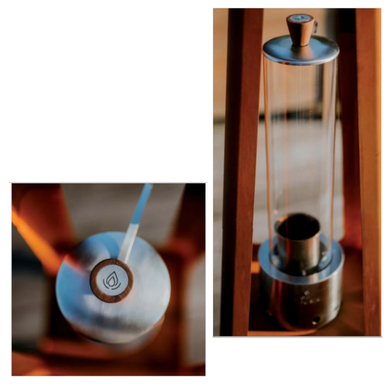 Behalten Sie Ihr Feuer unter Kontrolle Obwohl nexo-Lampen so konzipiert sind, dass sie so sicher wie möglich sind, ist Vorsicht nie schaden… Deshalb finden Sie unter dem Zubehör einen Flammenlöscher aus Edelstahl zum sicheren Löschen von Feuer.