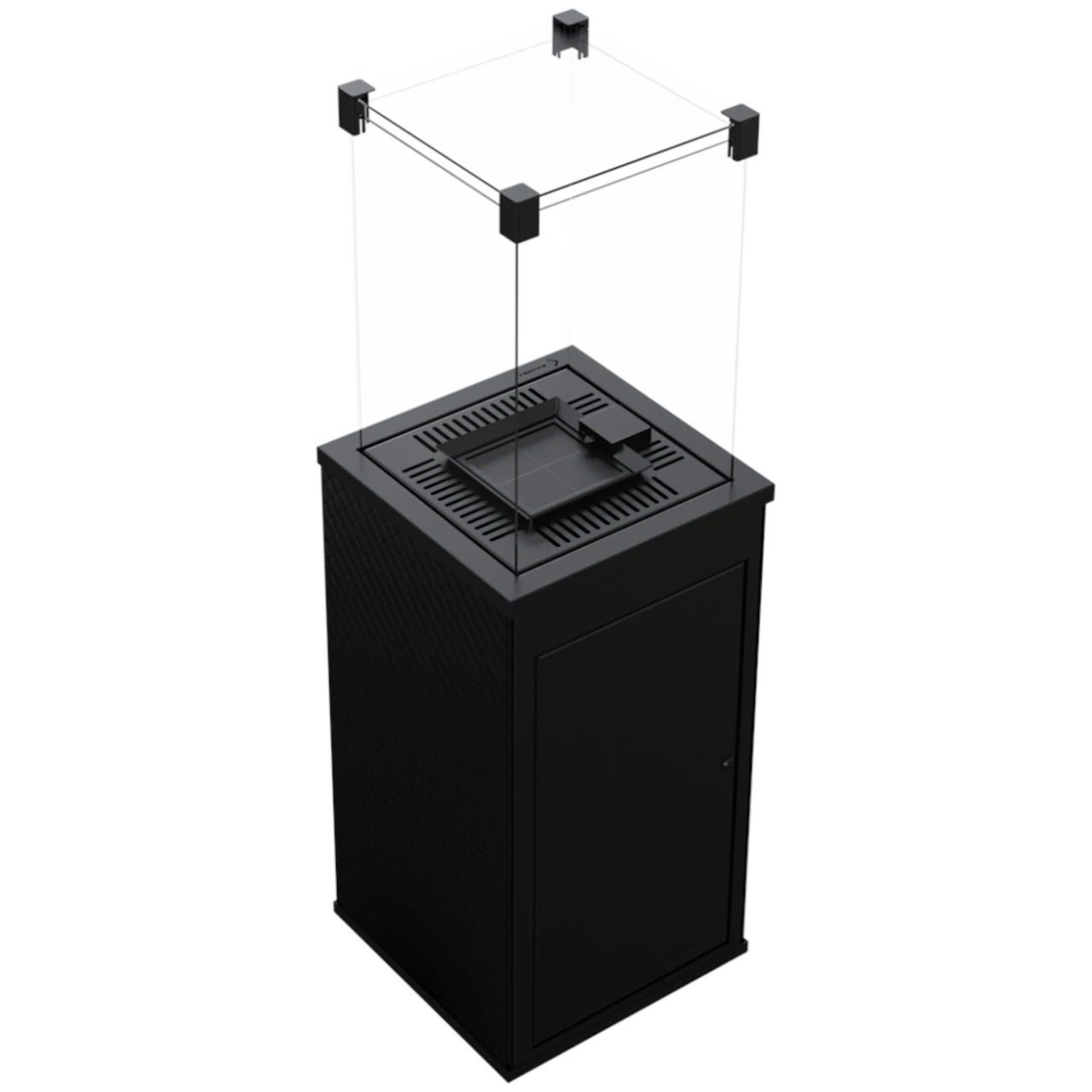 Der untere Teil der Heizung besteht aus schwarzen Glasscheiben mit einer gesteppten Struktur. Die vierte Seite ist mit einer Stahl Tür mit Schloss ausgestattet und beim Patio Mini mit einer Stahl Aushägetür.