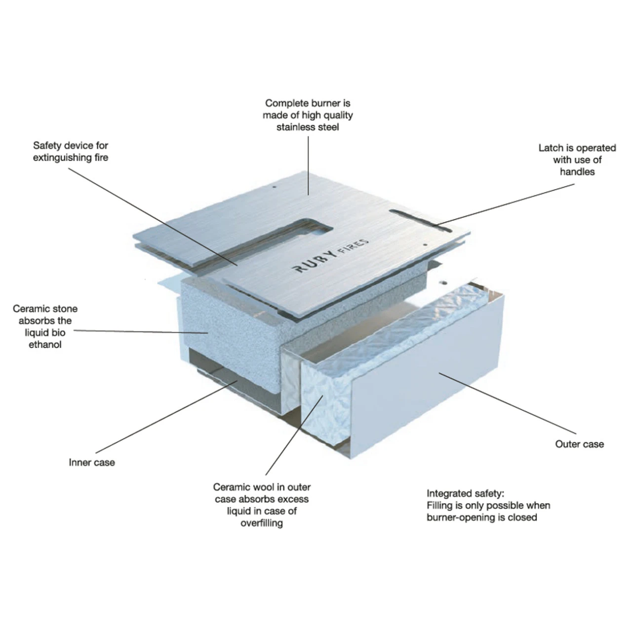 Die Brennflüssigkeit wird komplett durch einen keramische Stein absorbiert. Sobald der Brenner angezündet wird, sorgt der freikommende Dampf aus dem Stein für eine ruhige und ökonomische Verbrennung, welche im Vergleich zu herkömmlichen Brennern, bis zu 50% weniger Brennflüssigkeit verbraucht. Das sicherste offene Feuer!
