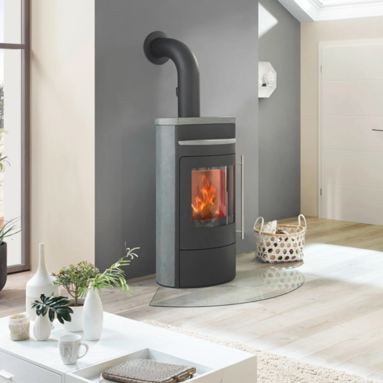 Der oval geformte Kaminofen TECAPA II Compact wertet jeden Wohnraum auf und passt durch seine Abmessungen auch in Nischen. Wählen Sie die Verkleidung zwischen Naturstein, Keramik oder massivem Stahl. Die Variante in schwarzem Stahl verfügt standardmäßig über das POWERSYSTEM mit Wärmespeichersteinen. Dadurch kann die Wärme des Feuers noch nach dem Erlöschen abgegeben werden. Und auch die Front wird nach Ihrem Geschmack gestaltet: Ihre Gäste blicken auf eine dezente Glastür mit Stahlrahmen oder eine bedruckte Ganzglasfront – siehe verschiedene Modelle. Ein Rüttelrost, das Aschefach zur einfachen Entleerung der Rückstände, die integrierte Scheibenspülluft sowie ein belüfteter Türgriff überzeugen als technische Features.